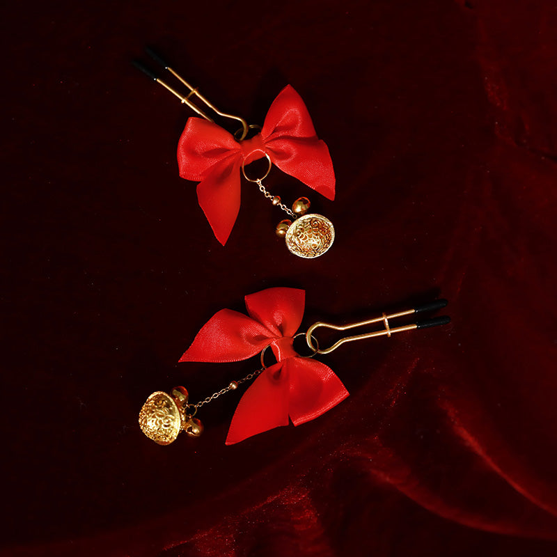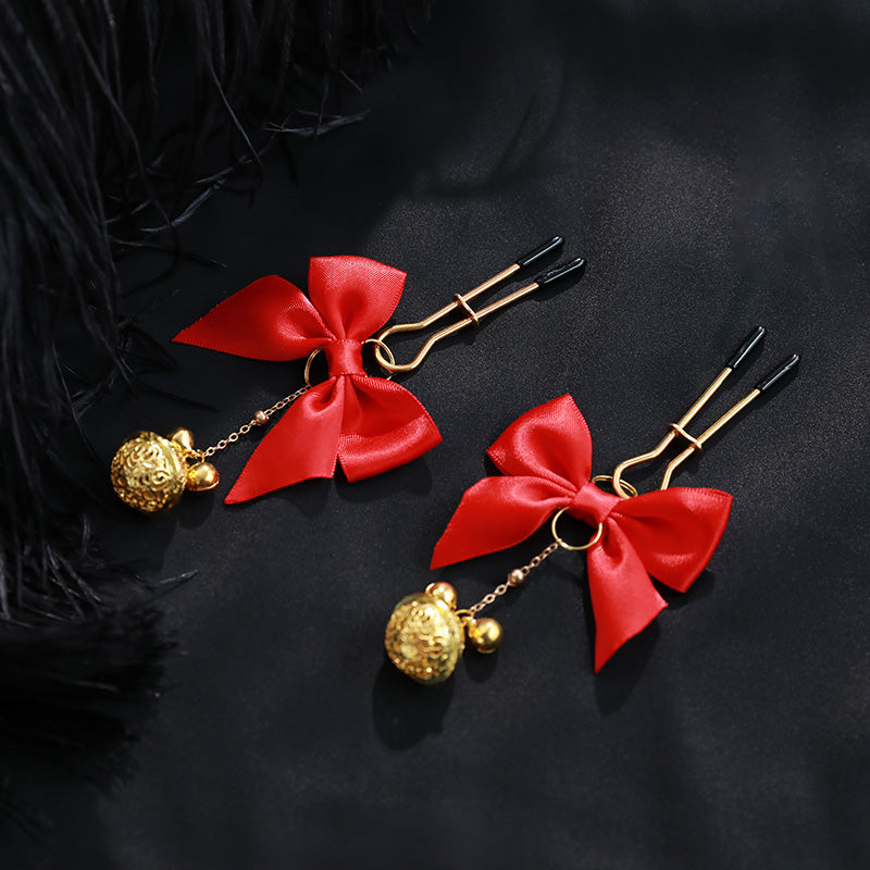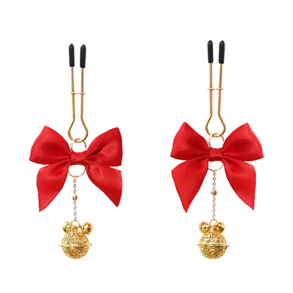 Fée et moi Adjustable Nipple Clamps with Bow & Bell offer a playful blend of elegance and sensation. Designed for gentle SM play, these clamps feature soft silicone tips for safe, skin-friendly wear and are finished with eye-catching red bows and golden bell charms. Each movement sets the bell in motion, adding a sensual rhythm to your intimate moments. The adjustable tension makes them suitable for both beginners and experienced users alike.