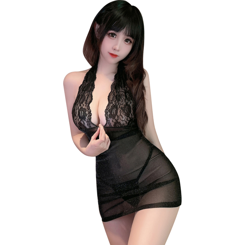 Step into the spotlight with the Fée et moi Glitter Lace Backless Mini Dress – a sultry, shimmering piece made to highlight every curve. Featuring a deep halter lace neckline, open back, and a see-through glitter mesh skirt, this lingerie set combines elegance with provocative charm. Paired with a matching thong, it's perfect for intimate nights or a sensual surprise.