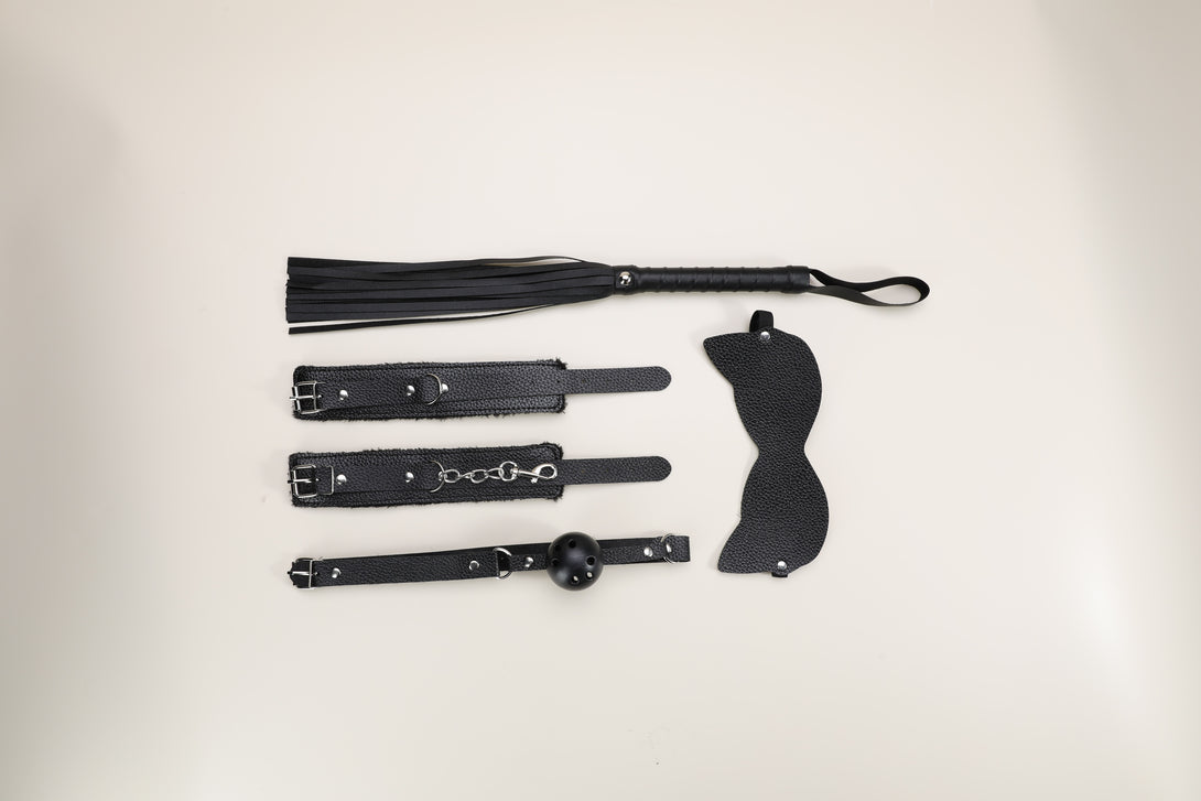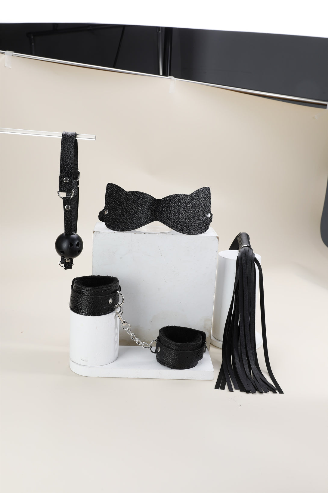 - Set Includes: 1 x Blindfold, 1 x Ball Gag (adjustable), 1 x Pair of Wrist Cuffs with Chain, 1 x Leash, 1 x Faux Leather Flogger
