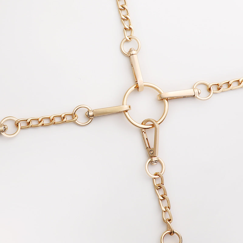 Upgrade your restraint setup with the MIZZ ZEE Gold Cross Buckle Restraint Connector. Designed to securely link four limbs for complete control, this elegant yet strong gold-tone metal set includes a center O-ring and four short connecting chains with durable lobster clasps. Compatible with most cuffs and collars, it’s a versatile enhancement for bondage scenarios where control, elegance, and style matter.