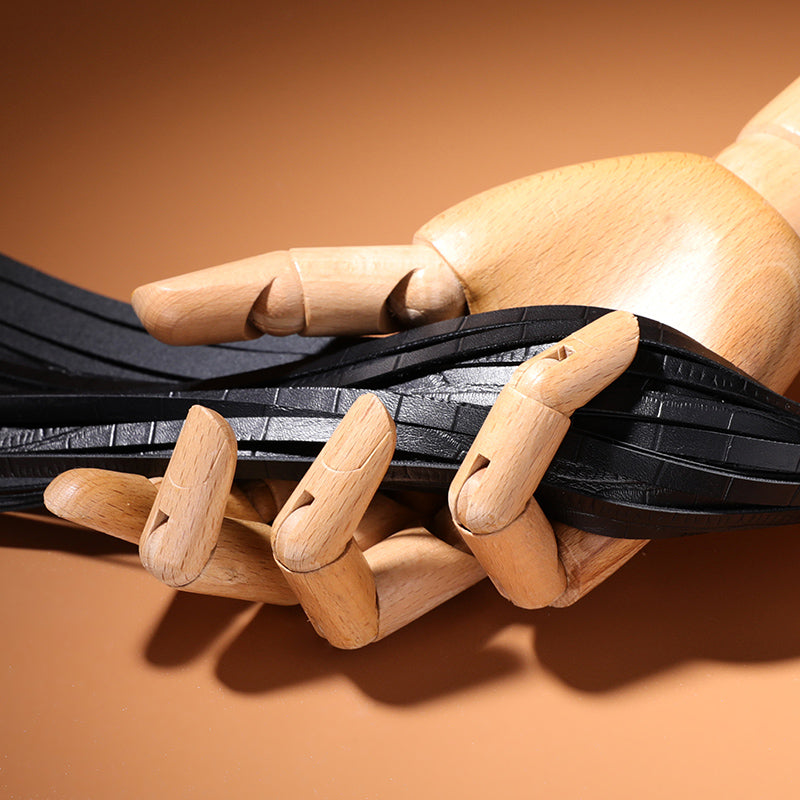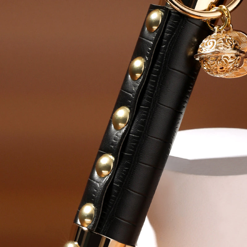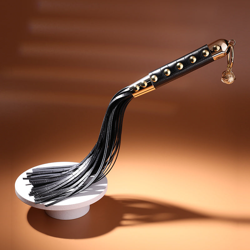 Make a bold statement in your play sessions with the MizzZee Bell Handle Faux Leather Whip. This stylish black whip combines visual elegance with satisfying impact, featuring a PU leather build and golden studs for a luxurious finish. The sturdy handle is adorned with a jingle bell and decorative charms, adding a touch of playful dominance to your BDSM collection. Perfect for both beginners and experienced users.