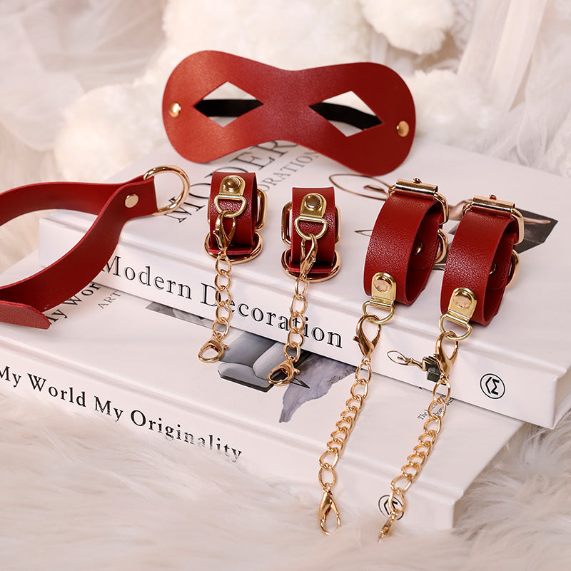 - Includes removable blindfold, collar, handcuffs, and leg cuffs with gold-tone chains